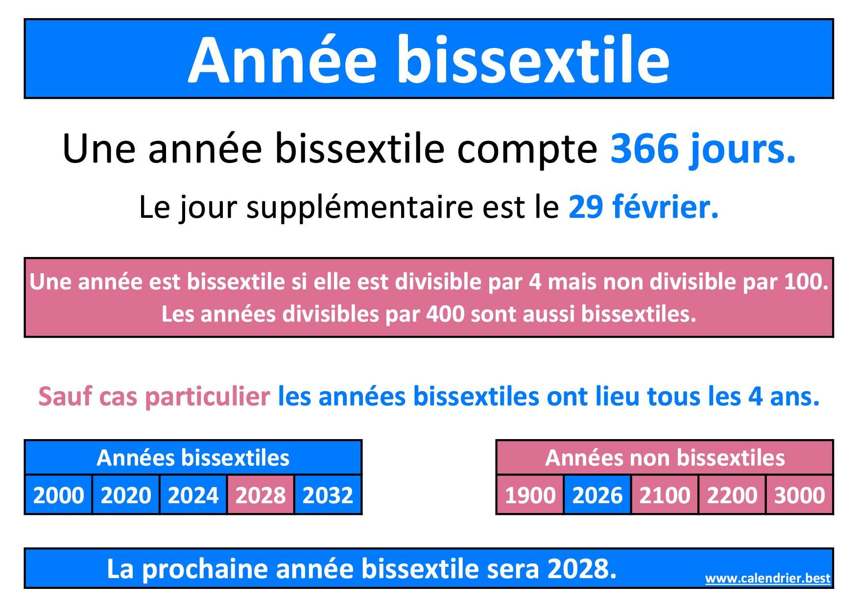 Une année bissextile est une année qui compte 366 jours au lieu de 365. Le jour supplémentaire est le 29 février. Sauf cas particulier les années bissextiles ont lieu tous les 4 ans. 2020 et 2024 étaient des années bissextiles et 2028 sera la prochaine.