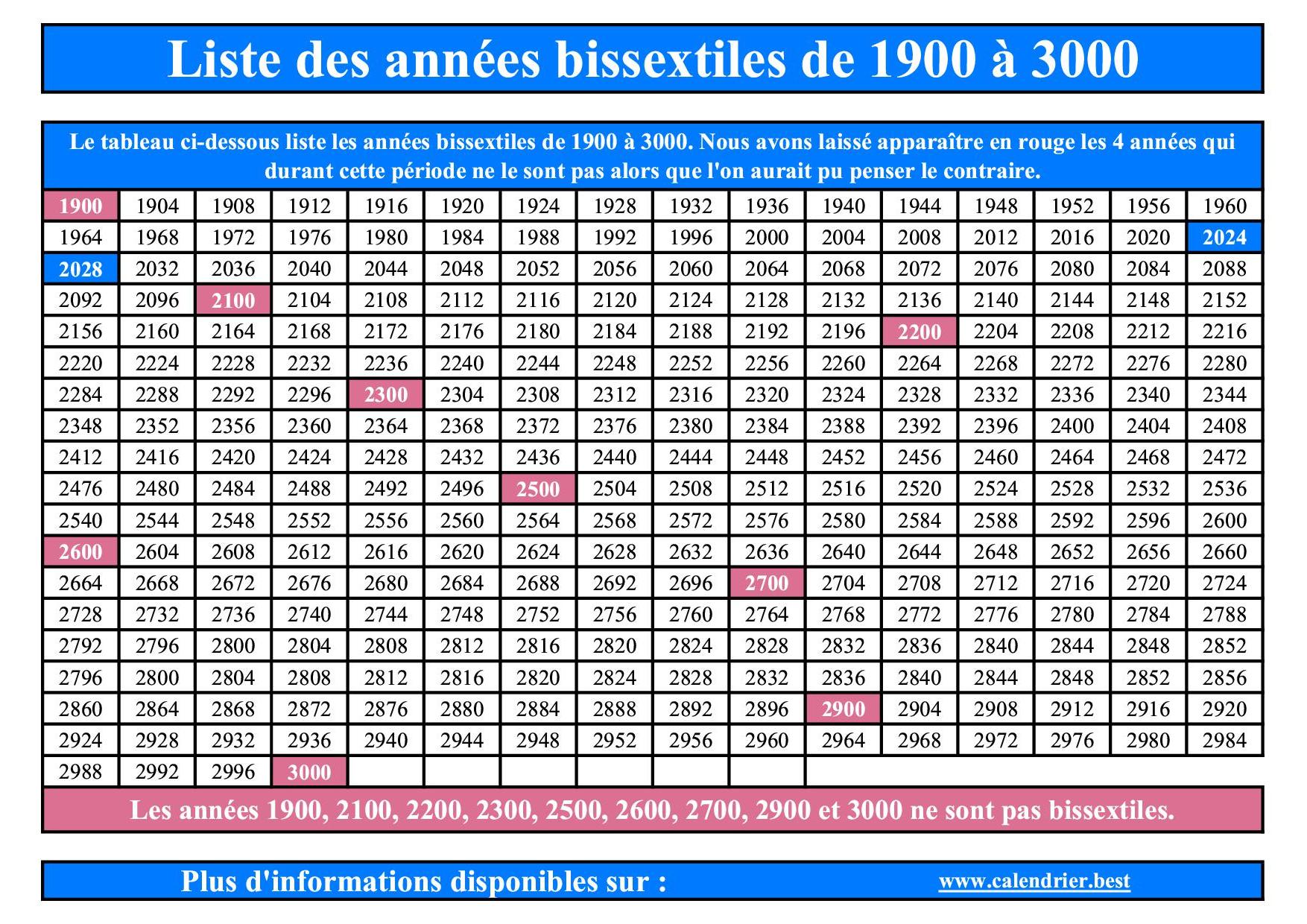 Le tableau ci-dessous liste les années bissextiles de 1900 à 3000. Nous avons laissé apparaître en rouge les 9 années qui durant cette période ne le sont pas alors que l'on aurait pu penser le contraire.