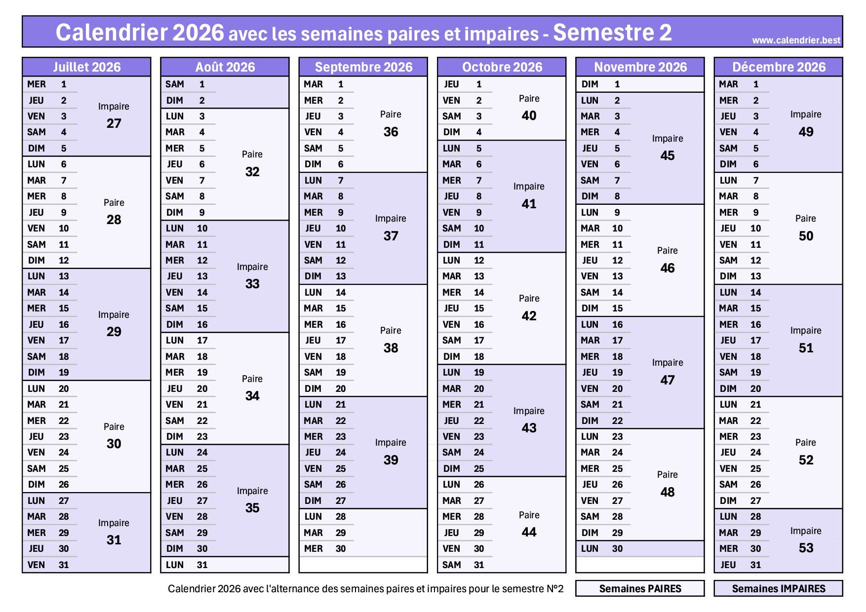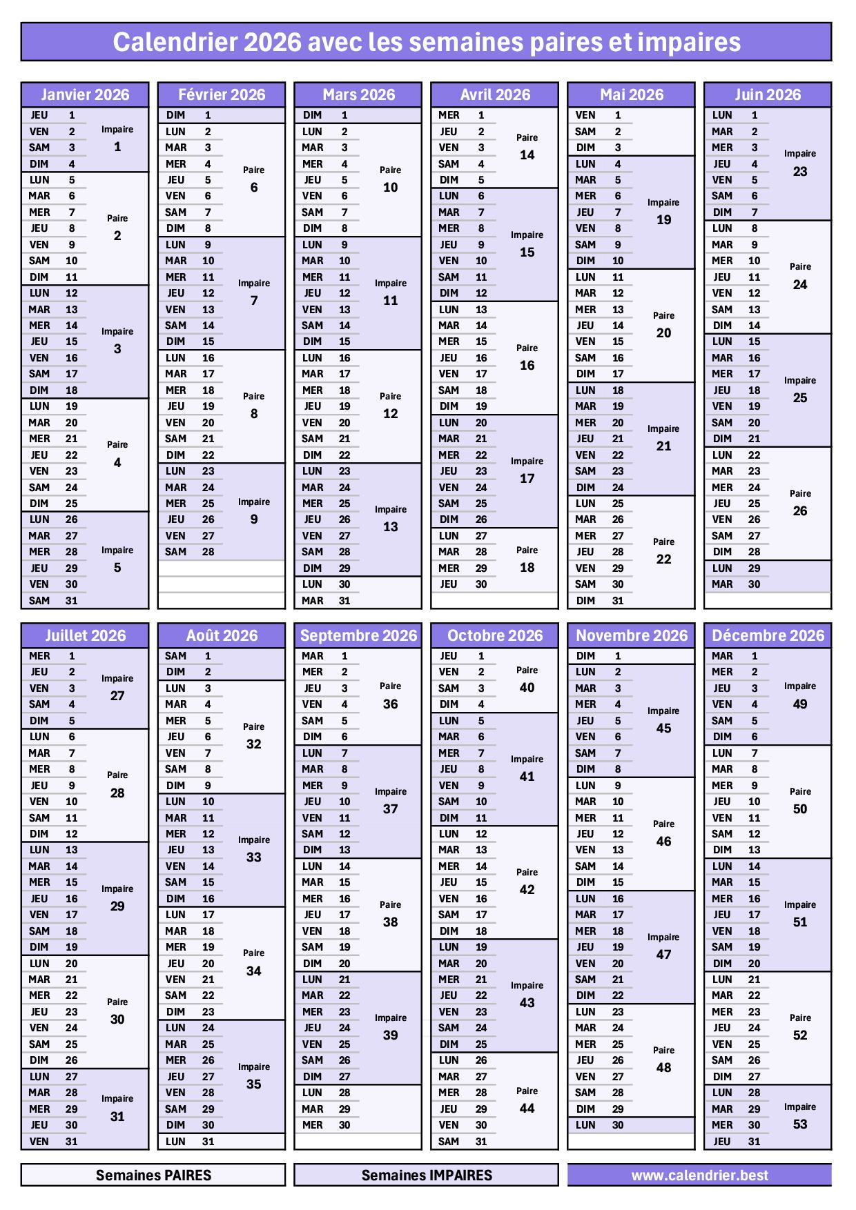 Calendrier 2026 semaines impaires en violet et