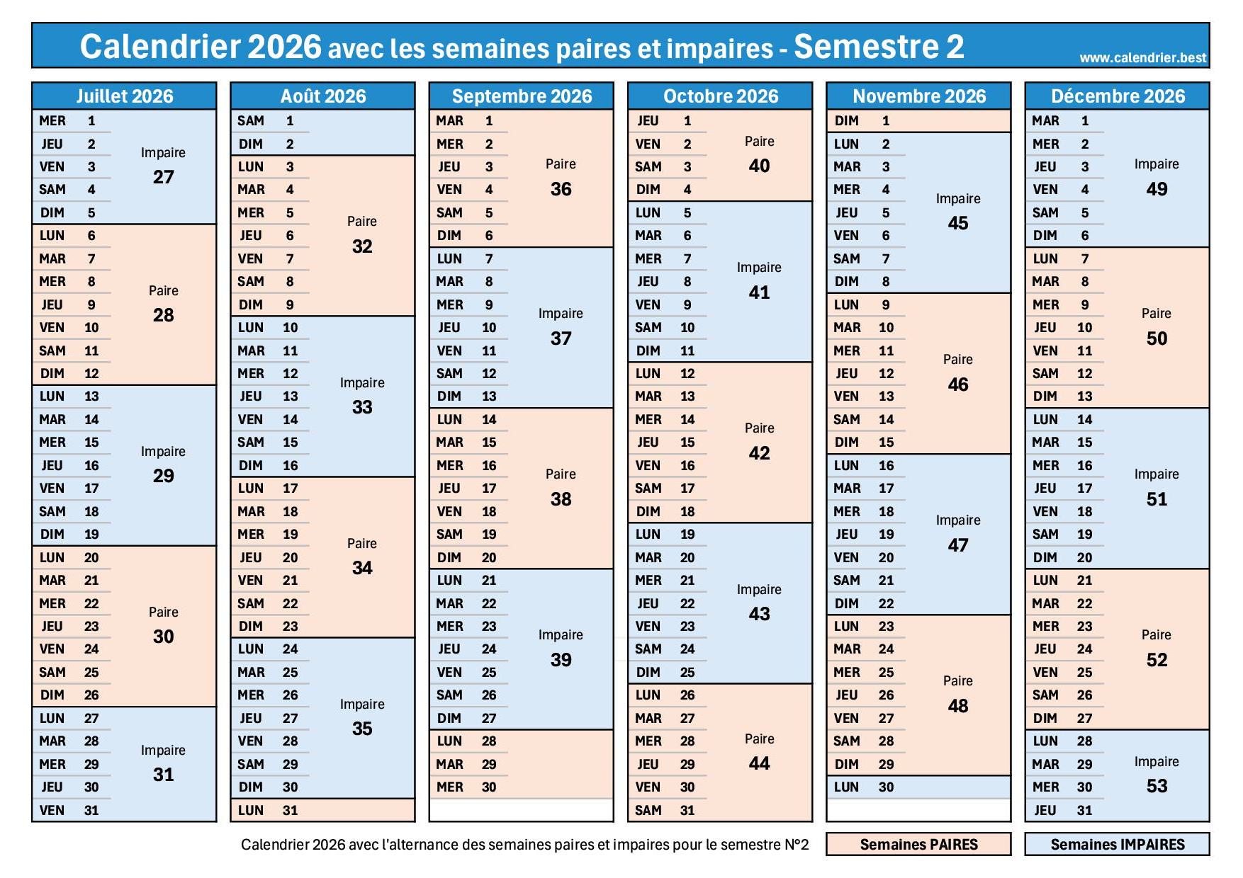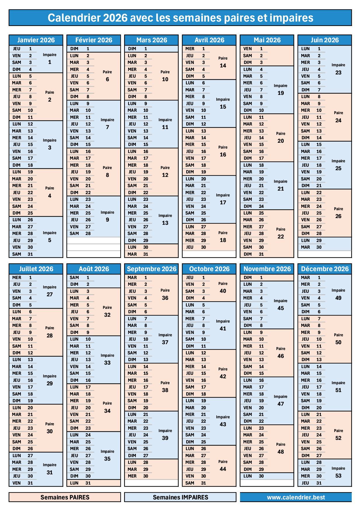 L'année 2026 comporte 27 semaines impaires, soit une de plus que les semaines paires, en raison de la présence d'une semaine 53, qui est impaire. Pour connaître le détail des semaines impaires et leurs dates exactes, une page spécifique est disponible, tandis que cette page se concentre sur des calendriers visuels à imprimer.