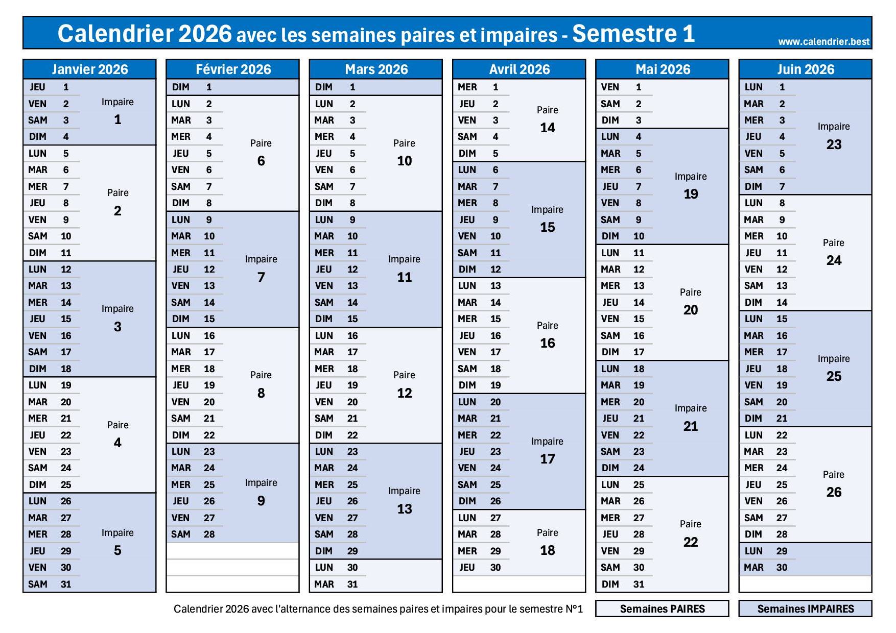 Calendrier janvier à juin 2026 semaines impaires en bleu