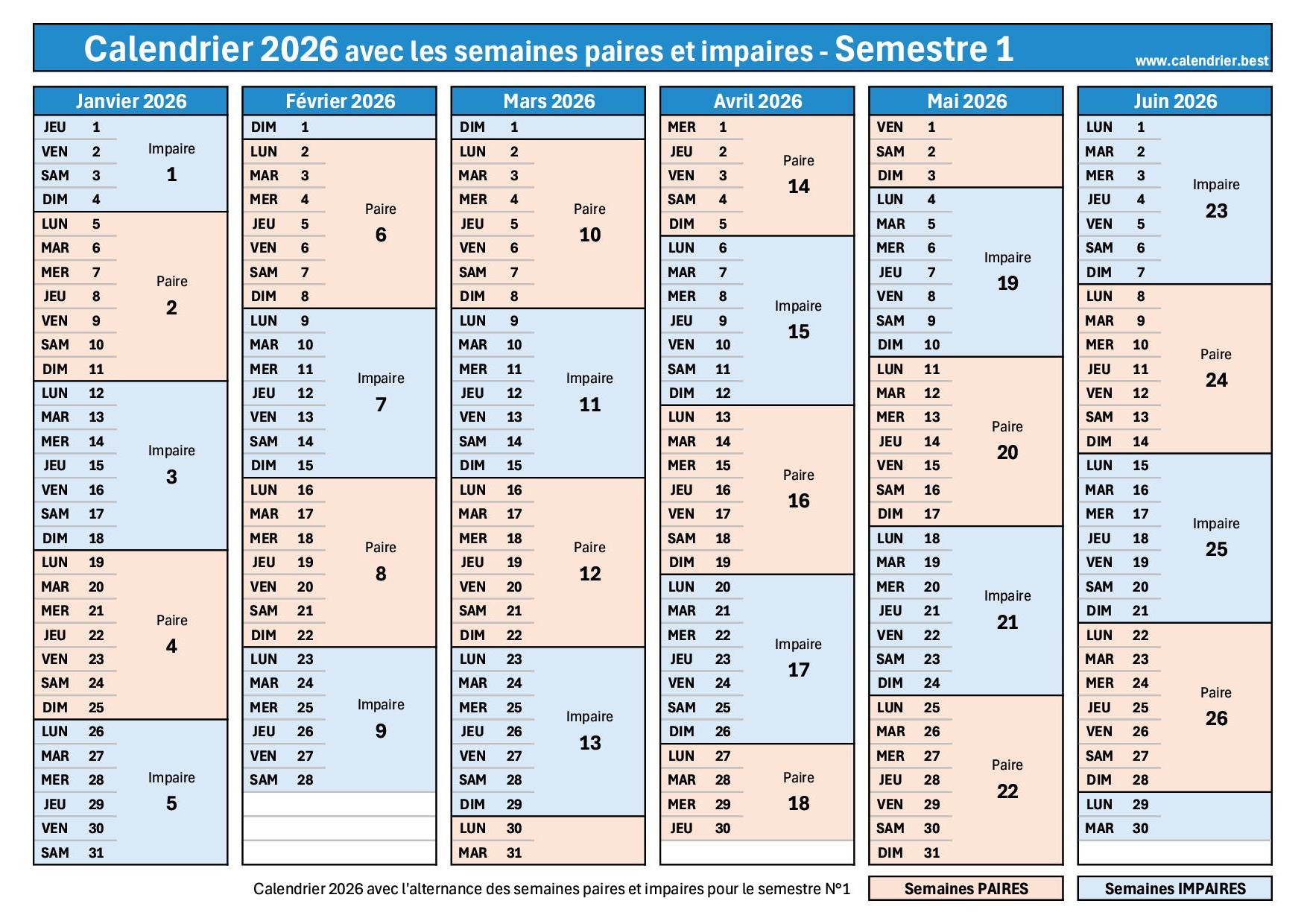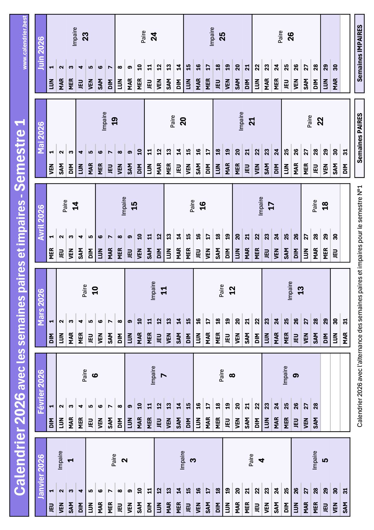 Calendrier semestre 1 2026 semaine paire et impaire