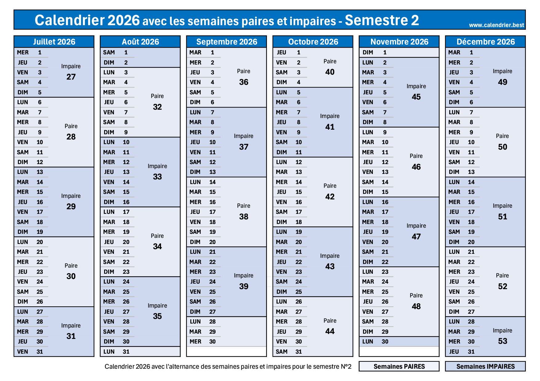 Calendrier juillet à décembre 2026 semaines impaires en bleu