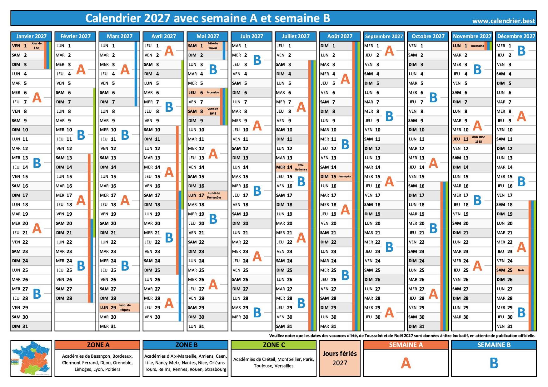 Notre calendrier pour l'année civile 2027 avec l'alternance des semaines A et des semaines B est téléchargeable librement au format pdf ou en jpg. Vous pourrez l'imprimer sur une feuille A4. Notre calendrier répertorie en plus des semaines A et B les dates des vacances scolaires et les jours fériés.