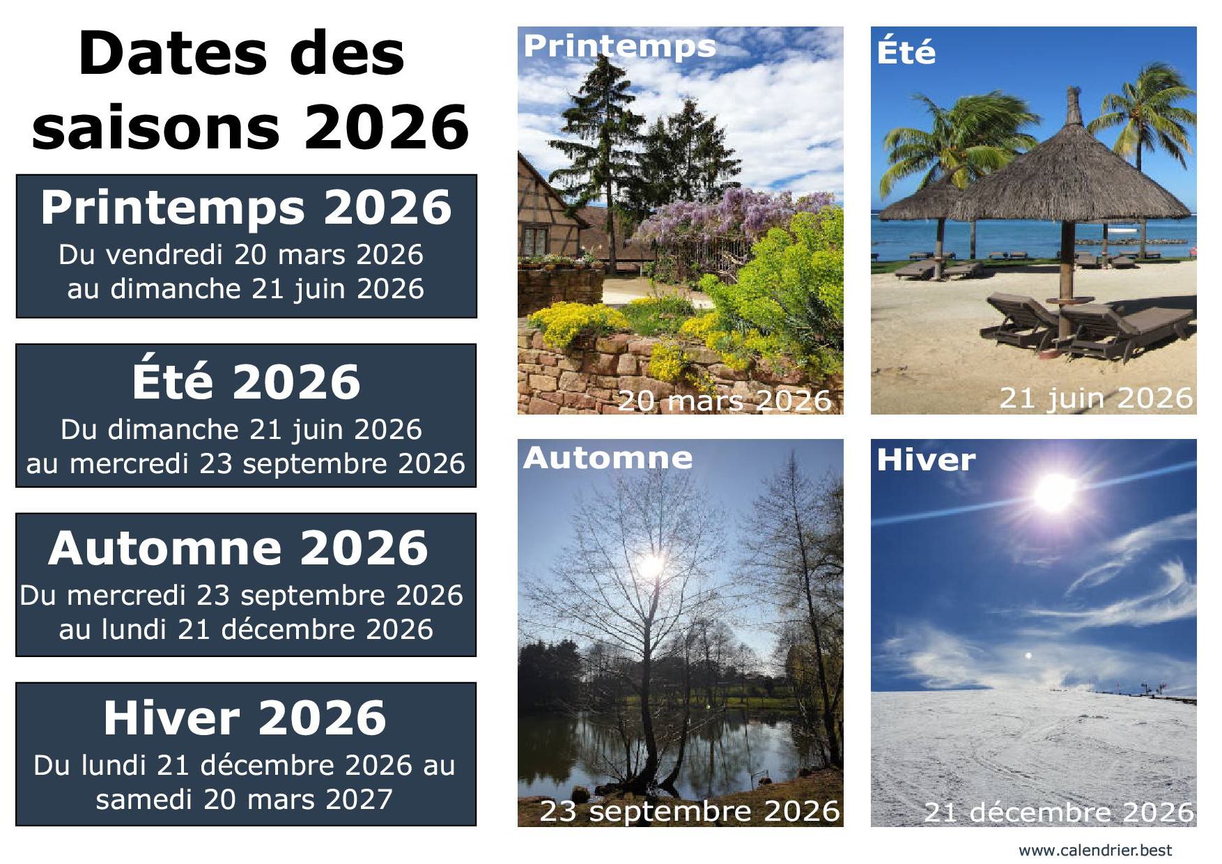 Découvrez les dates des changements de saisons en 2025 et 2026 grâce à notre infographie détaillée. Visualisez facilement les débuts et fins de l'hiver, du printemps, de l'été et de l'automne pour mieux planifier vos activités tout au long de l'année. Téléchargez notre infographie en format PDF ou JPG et anticipez les transitions saisonnières avec précision.