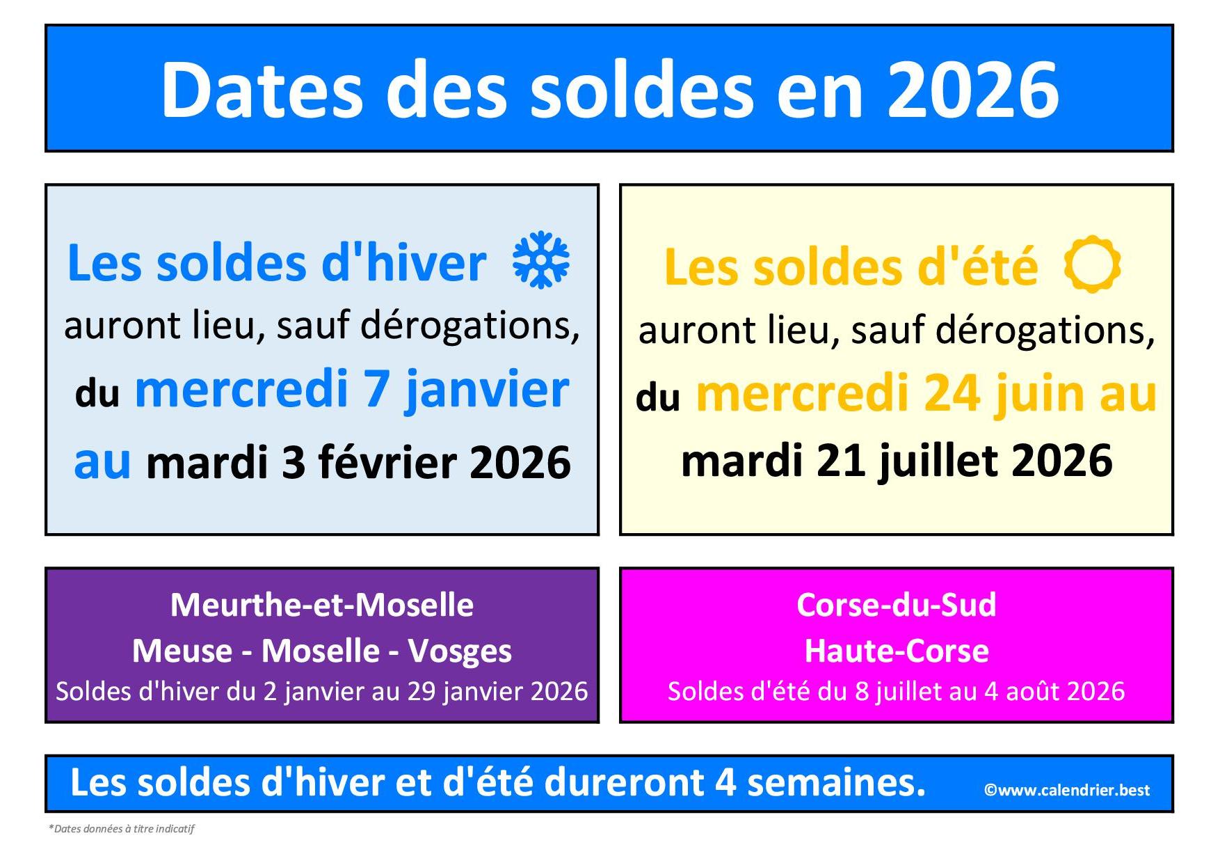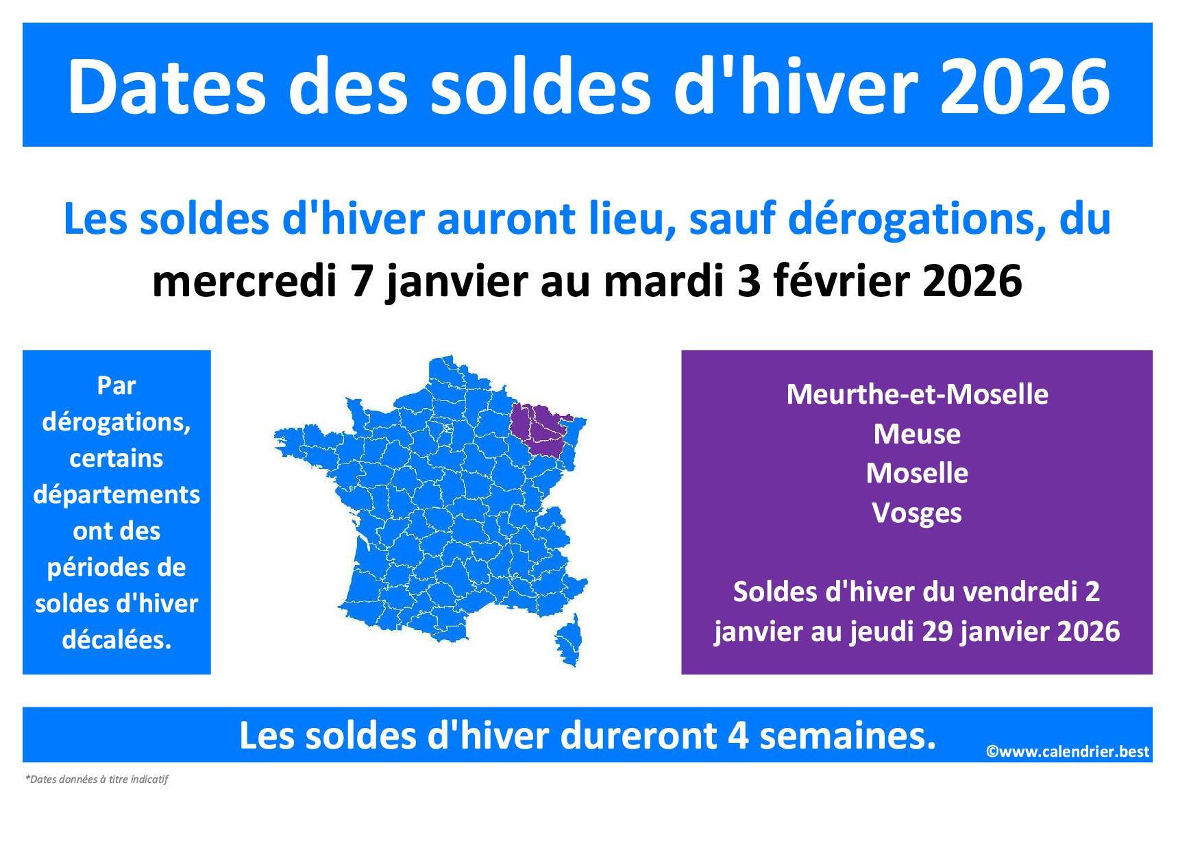 Les dates des soldes d'hiver pour les départements de la Meurthe-et-Moselle, de la Meuse, de la Moselle et des Vosges sont données à titre indicatif. Un texte d'application fixant les dates des soldes d'hiver 2026 dans les départements faisant exception sera publié prochainement.