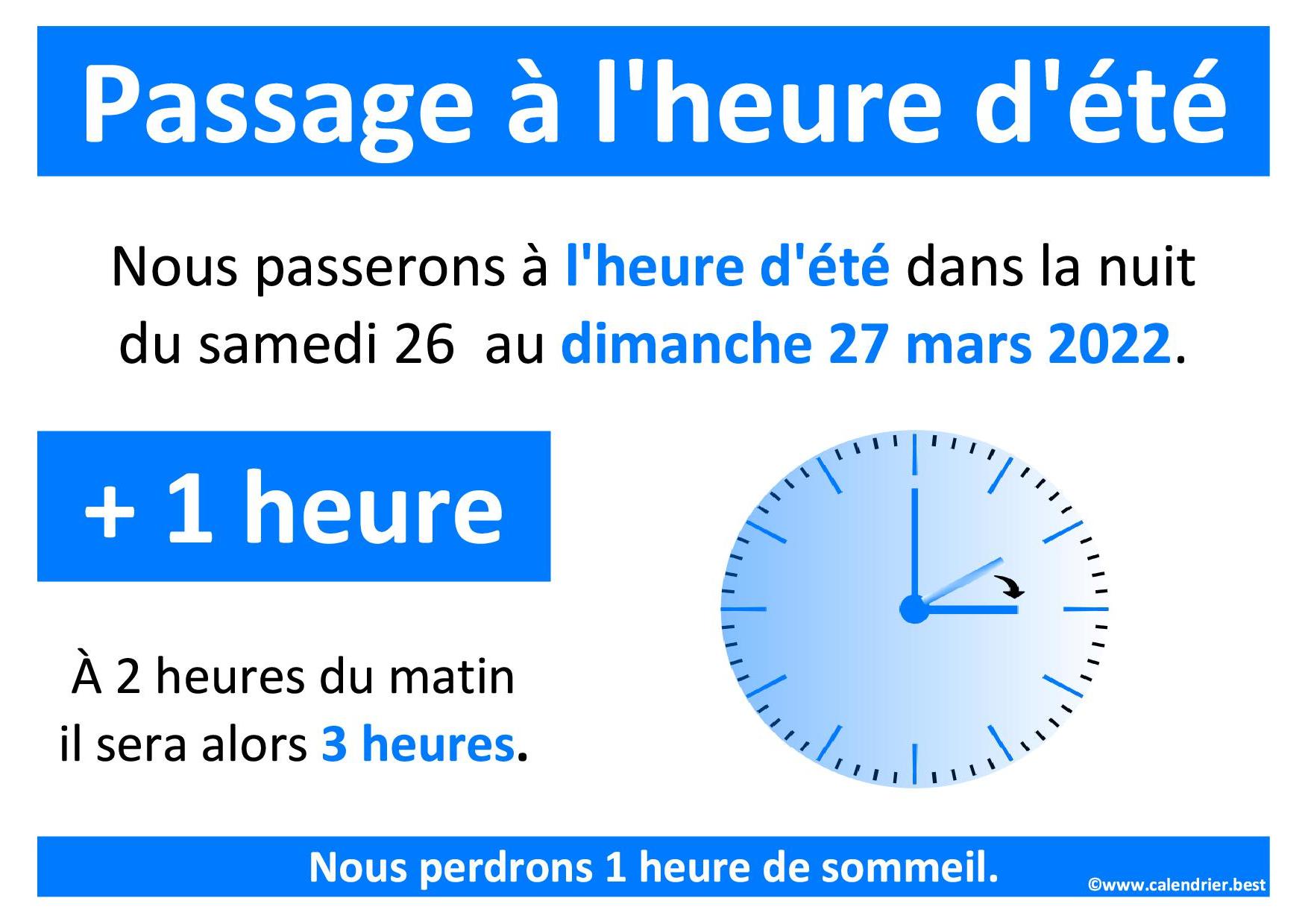 En 2022 la passage à l'heure d'été aura lieu dans la nuit du samedi 26 au dimanche 27 mars 2022. Nous perdrons une heure de sommeil (🕒 + 1 Heure) : à 2 heures du matin il sera 3 heures.