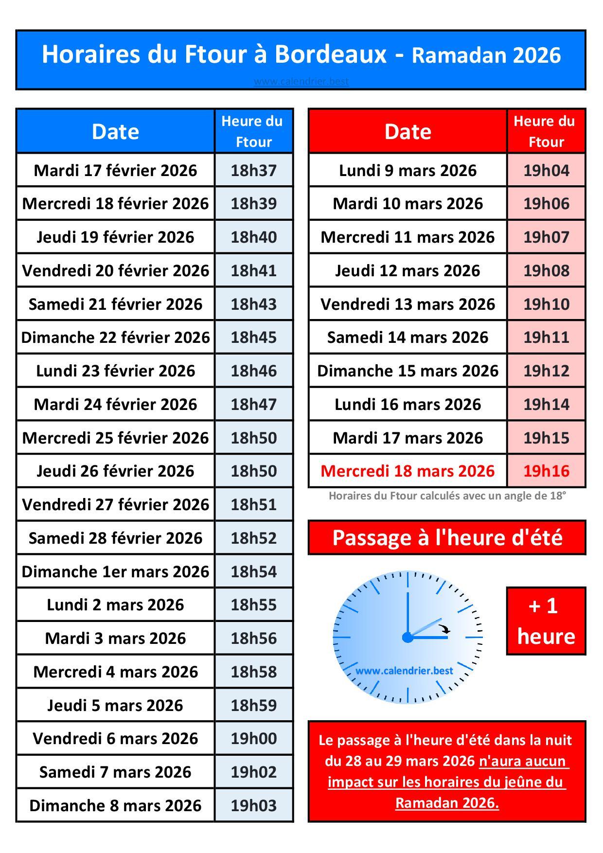 🕐 Bonne nouvelle : le passage à l'heure d'été (dans la nuit du 28 au 29 mars 2026) n'aura pas d'impact sur le Ramadan 2026 à Bordeaux. En effet, le mois de Ramadan 2026 se termine dans la soirée du mercredi 18 mars 2026, soit plusieurs jours avant le changement d'heure : les horaires du Ftour restent donc inchangés pendant toute la période du jeûne.
