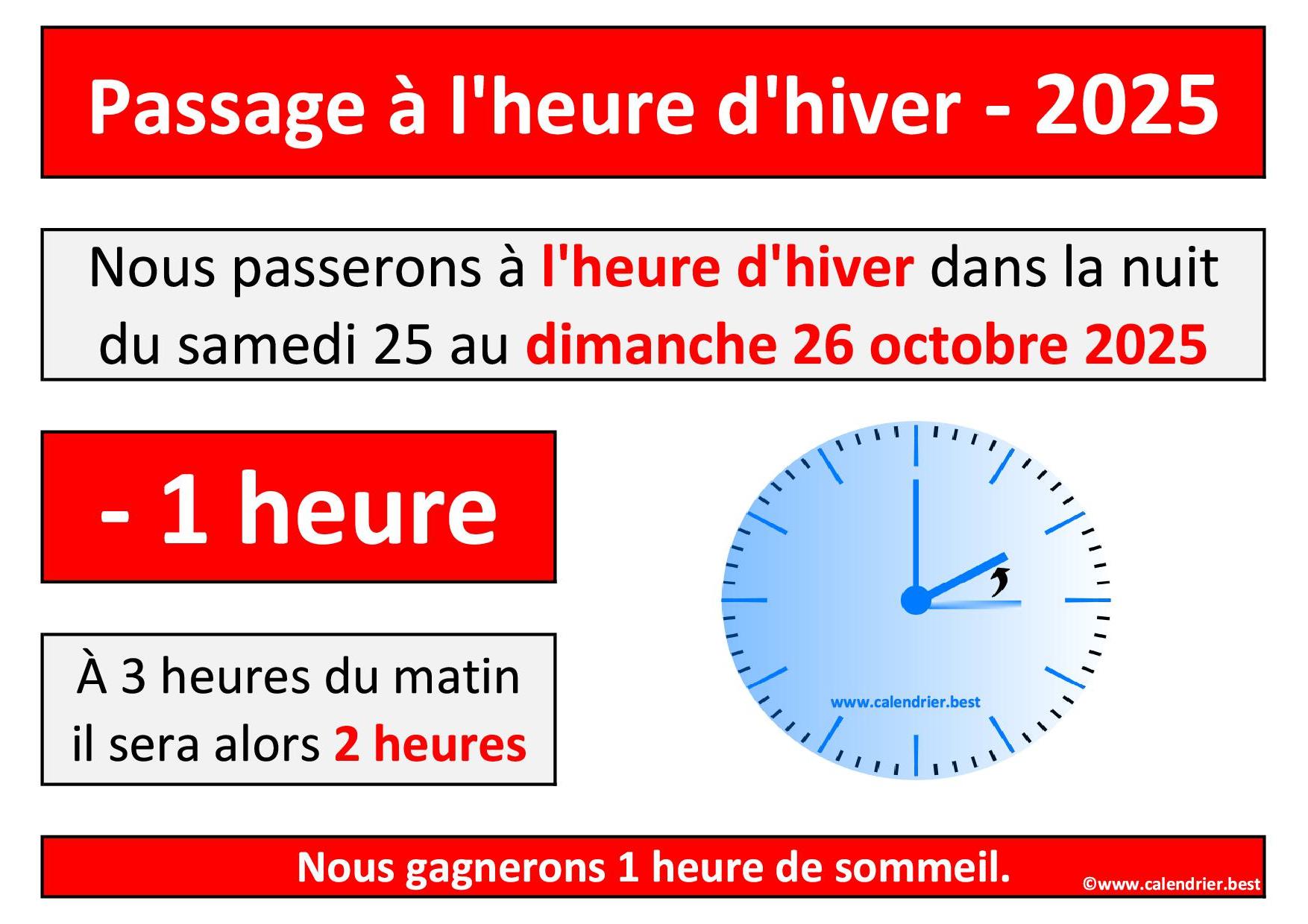 En 2025, la passage à l'heure d'hiver aura lieu dans la nuit du samedi 25 au dimanche 26 octobre 2025. Nous gagnerons une heure de sommeil (🕒 - 1 Heure) : à 3 heures du matin il sera 2 heures.