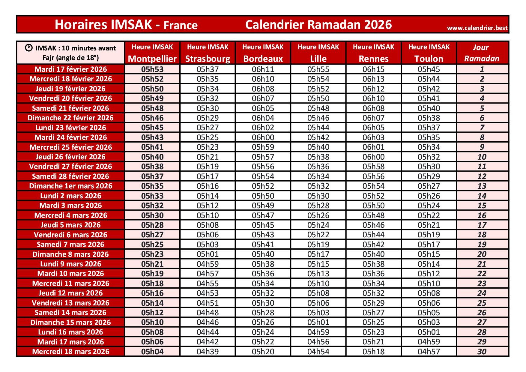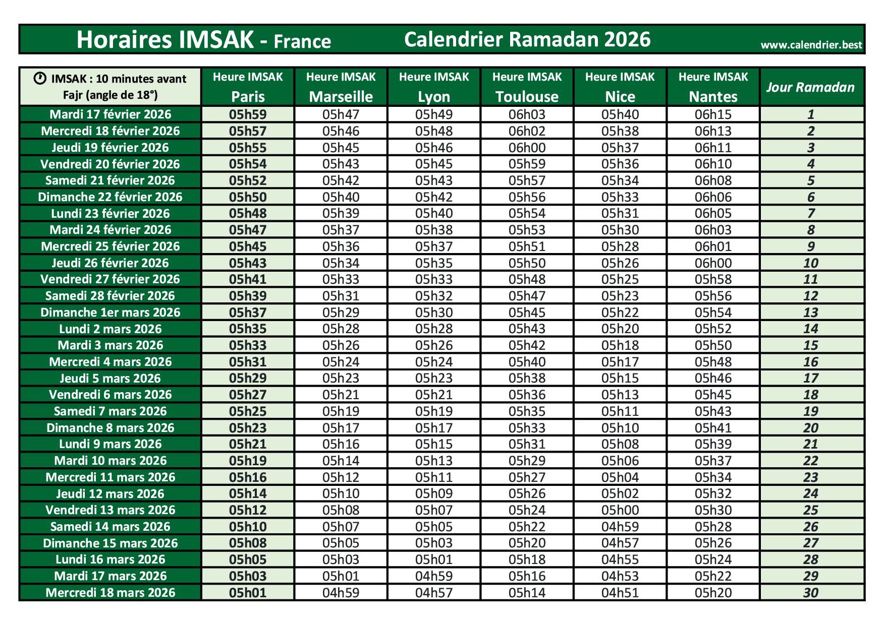 Calendrier 2026 avec les heures de l'Imsak pour Paris, Marseille, Lyon, Toulouse, Nice, Nantes