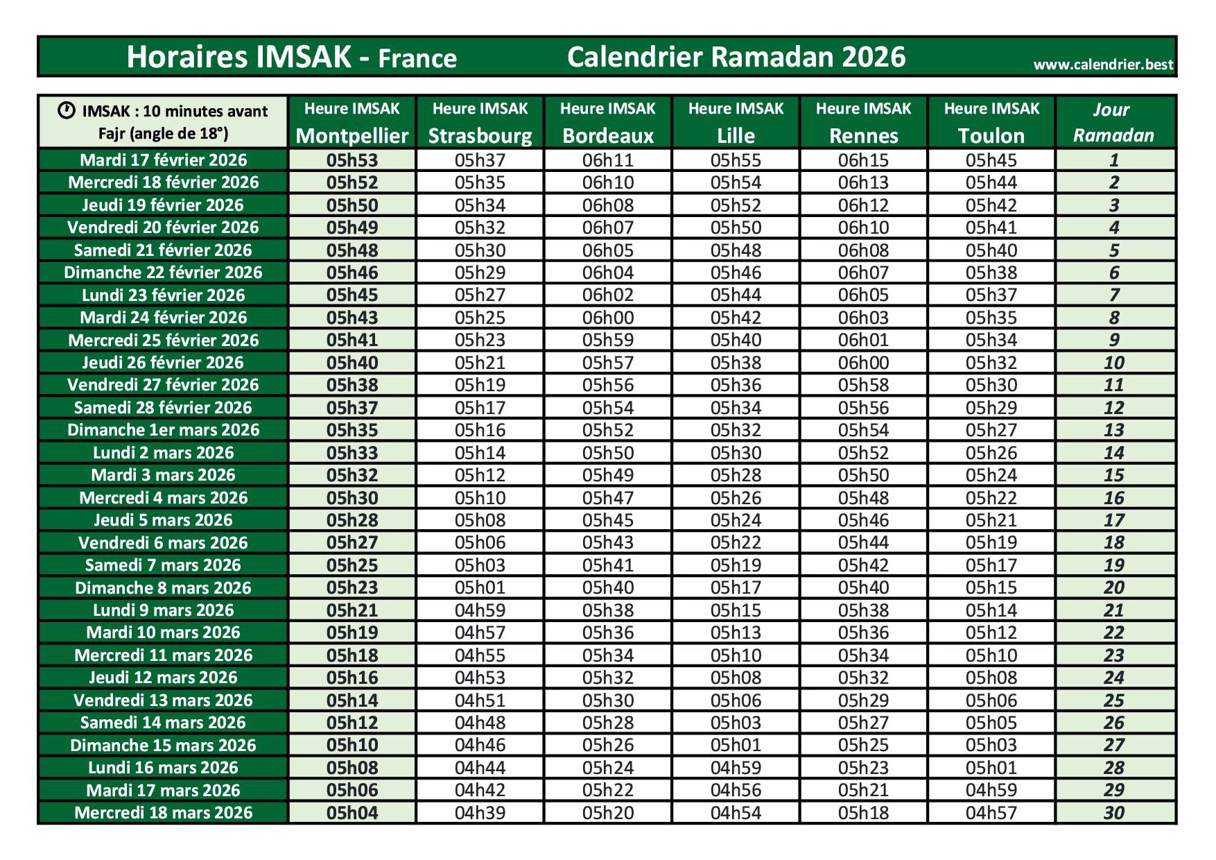 Heure de l'Imsak Ă Montpellier, Strasbourg, Bordeaux, Lille, Rennes, Toulon - Ramadan 2026