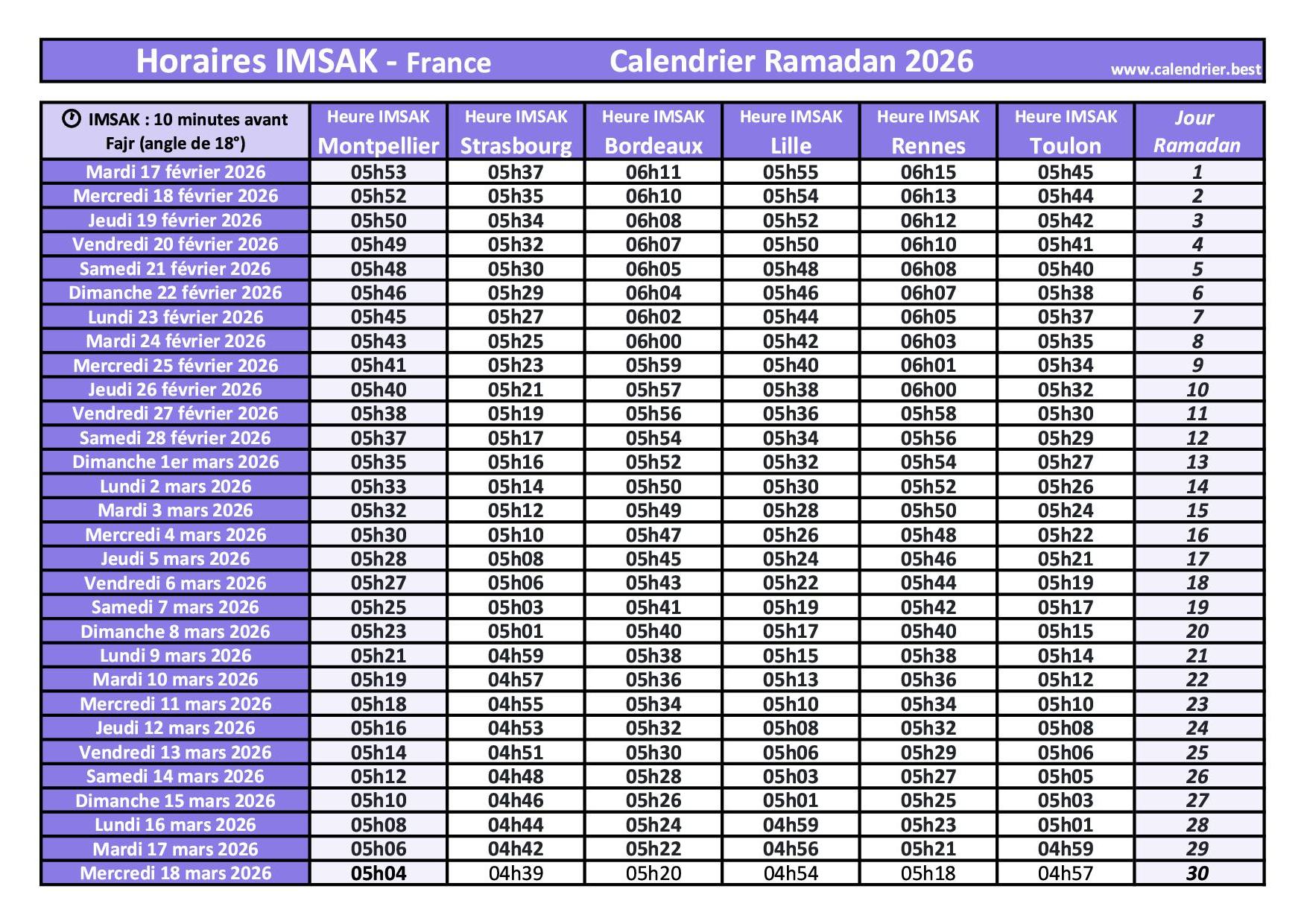 - Calendrier avec les heures de l'Imsak pour Montpellier, Strasbourg, Bordeaux, Lille, Rennes, Toulon.