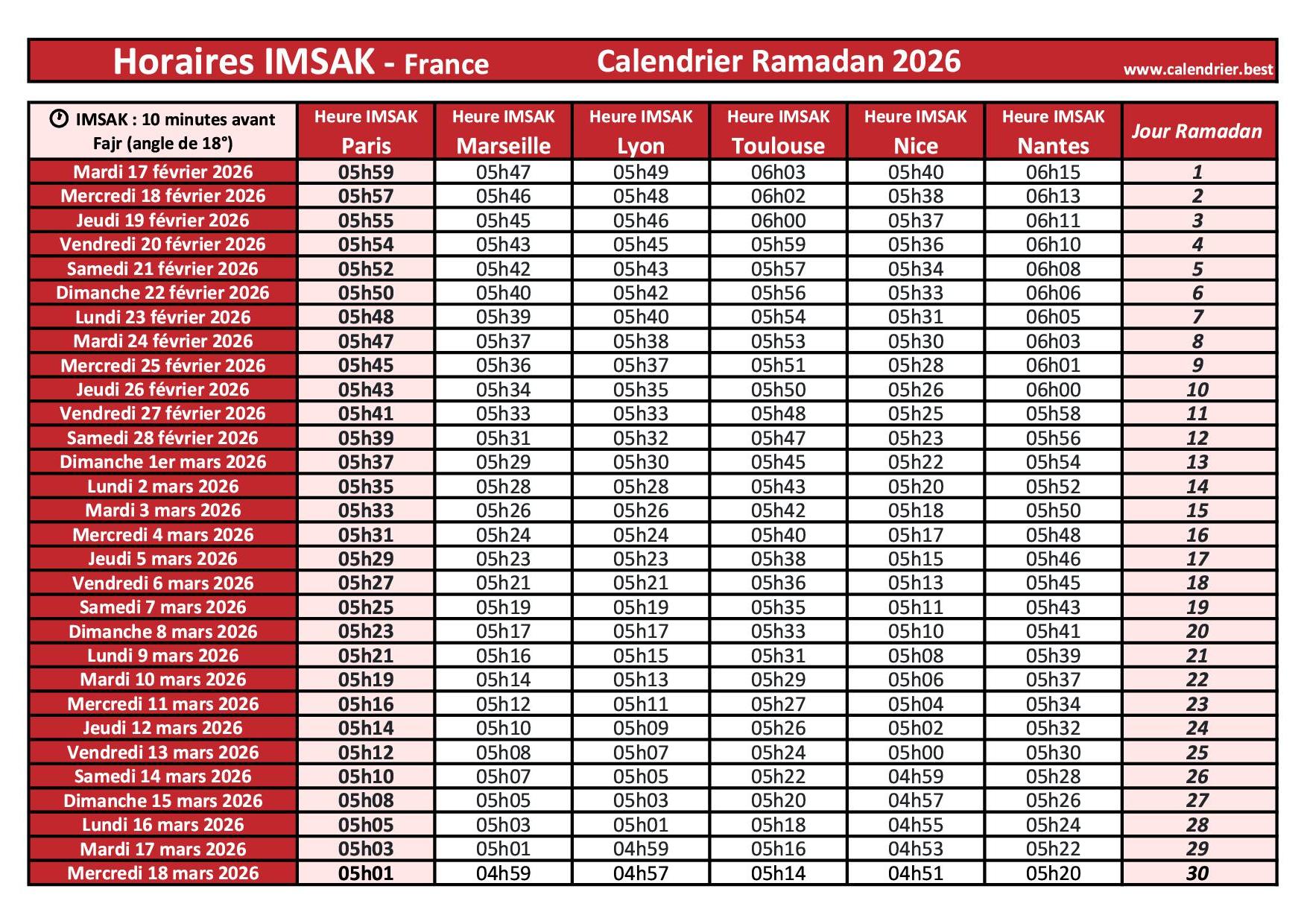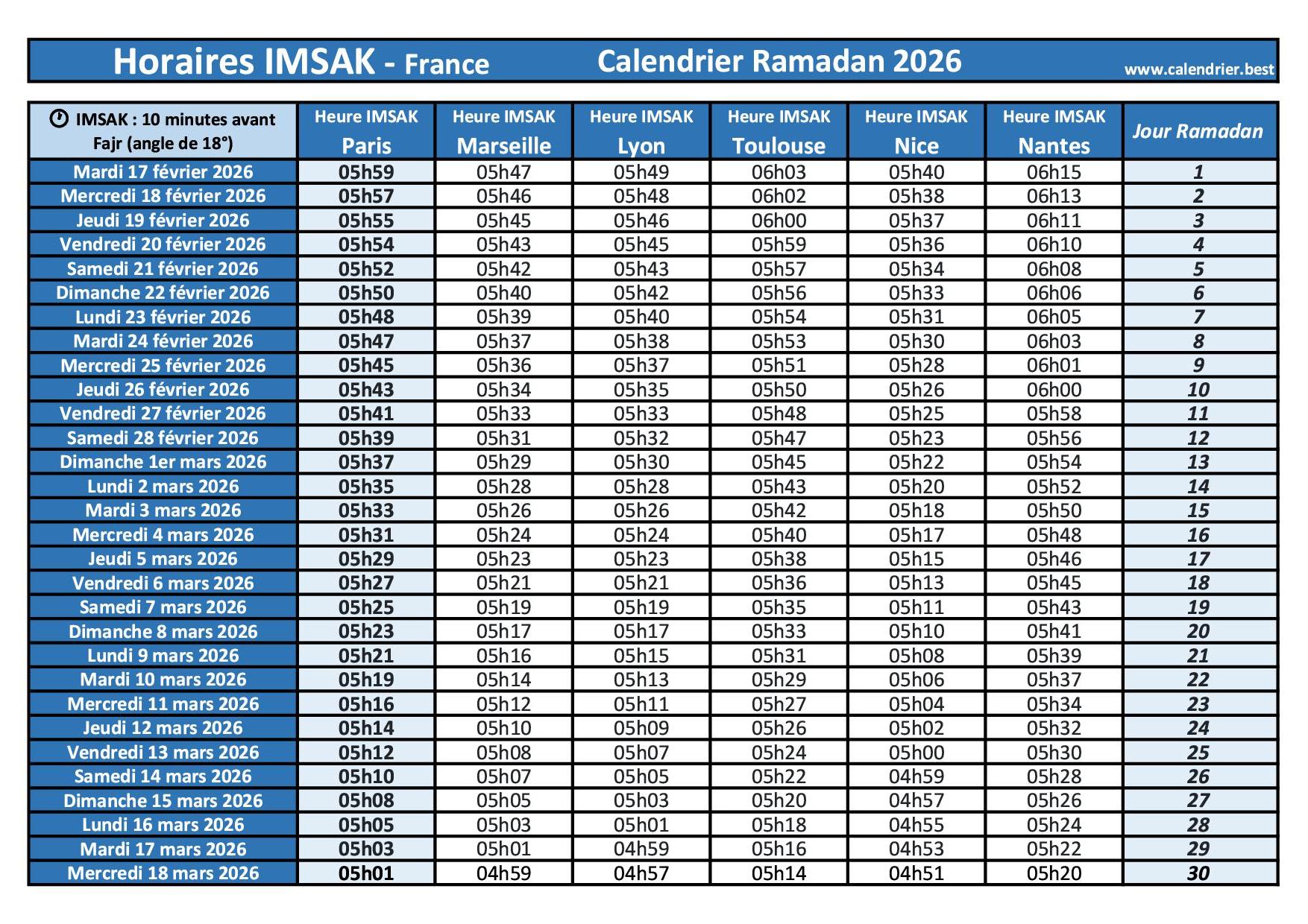 Pour complĂ©ter notre guide des horaires de l'Imsak pour le Ramadan 2026, nous avons conçu des calendriers spĂ©cialement dĂ©diĂ©s aux pratiquants des principales villes françaises. Ils vous permettront de garder un Ćil sur les horaires quotidiens de l'Imsak et d'organiser vos journĂ©es de jeĂ»ne avec sĂ©rĂ©nitĂ© et prĂ©cision. Faciles Ă tĂ©lĂ©charger et Ă imprimer, ils se veulent ĂȘtre des compagnons indispensables tout au long du Ramadan.