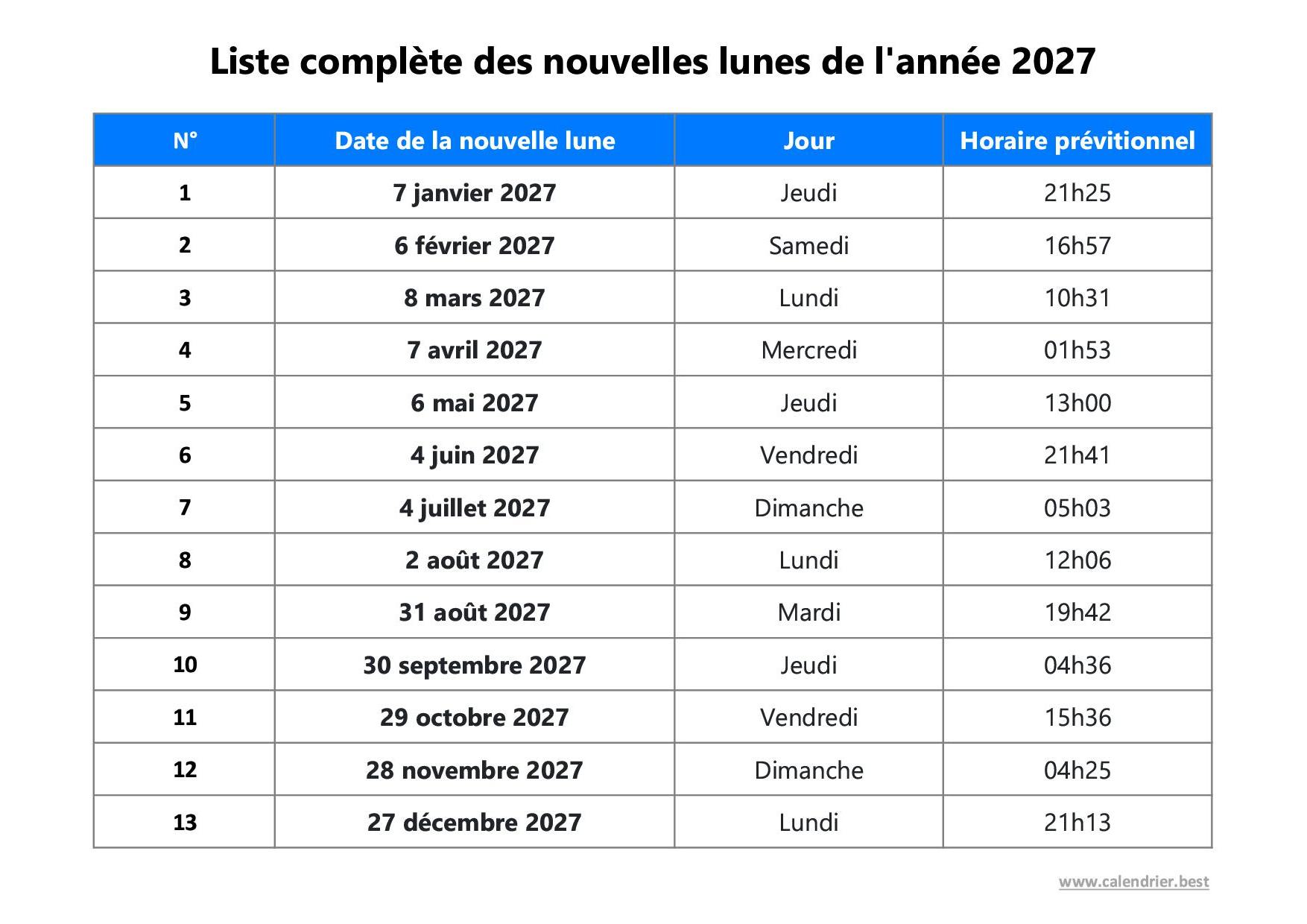 - Les jours, dates et horaires des Nouvelles Lunes 2027.