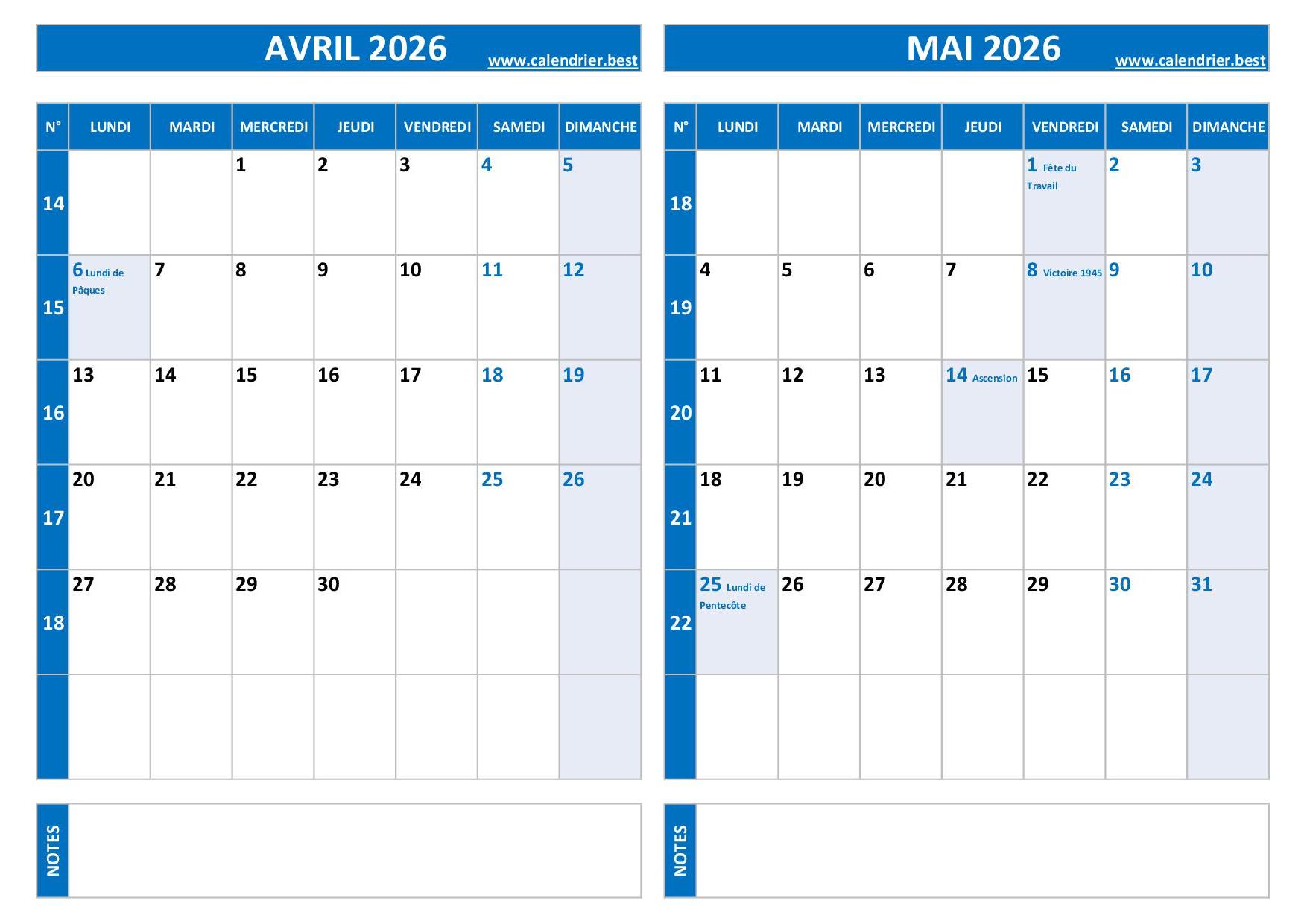 Calendrier Avril - Mai 2026 à télécharger
