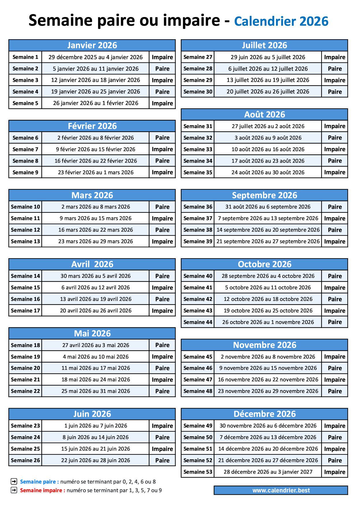 Calendrier 2026 des semaines paires et impaires (par semaine)