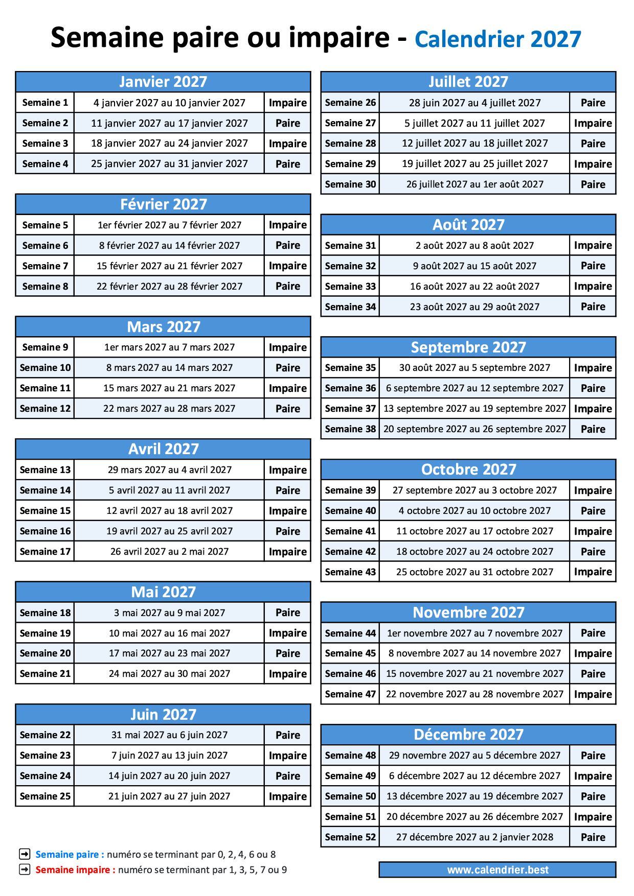 | Semaine 27 | 5 juillet 2027 au 11 juillet 2027 | Impaire |