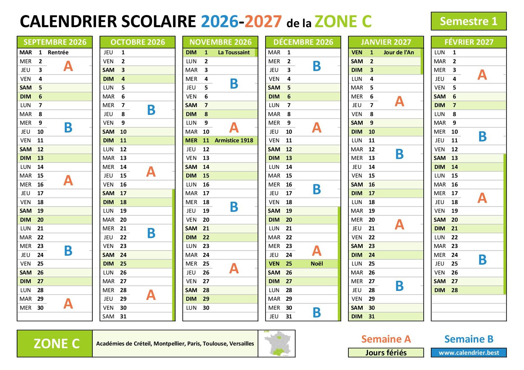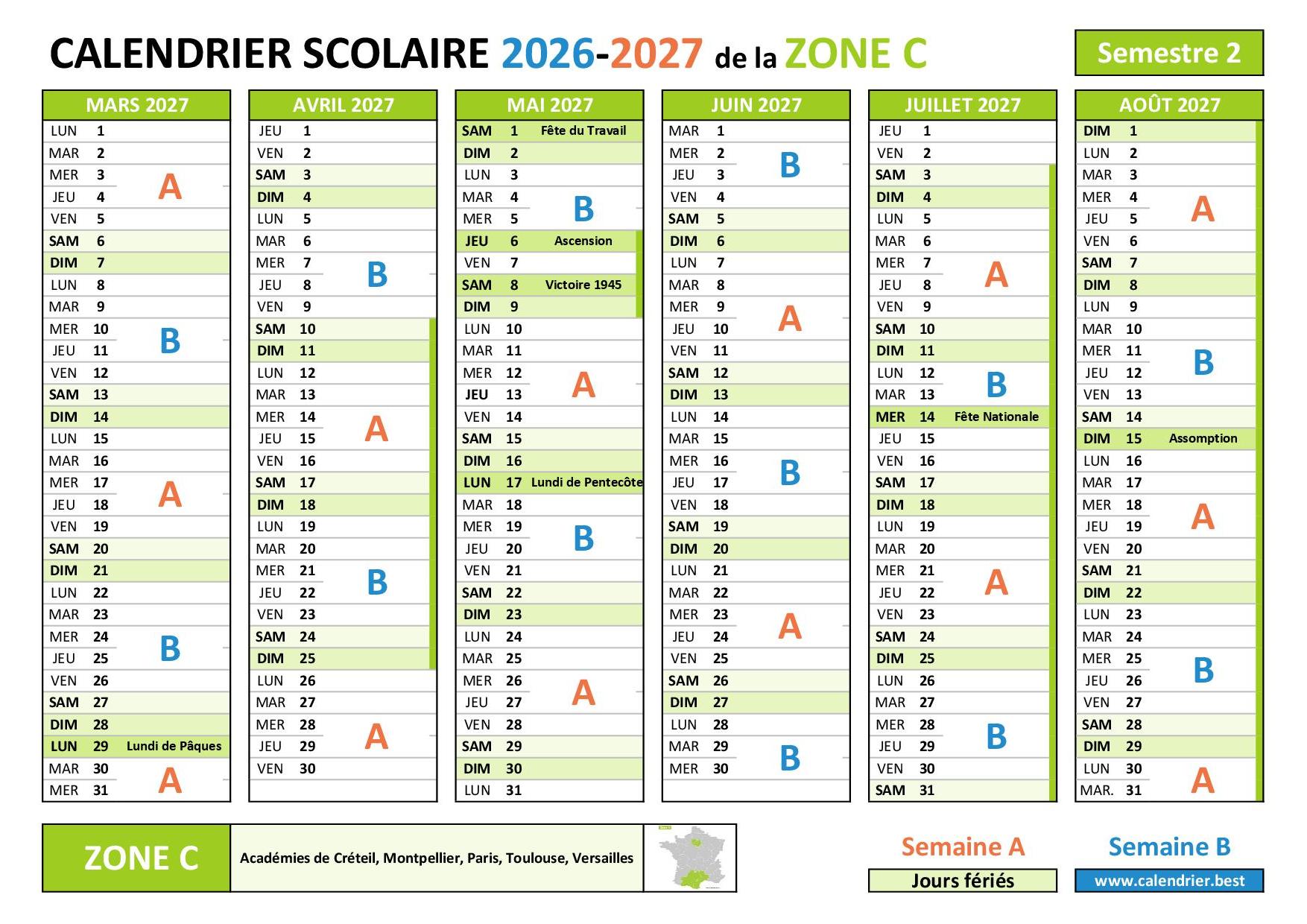 TĂ©lĂ©chargez le calendrier scolaire 2026-2027 de la zone C avec l'alternance des semaines A/B, les vacances et les jours fĂ©riĂ©s. Disponible en PDF et JPG, prĂȘt Ă imprimer gratuitement.