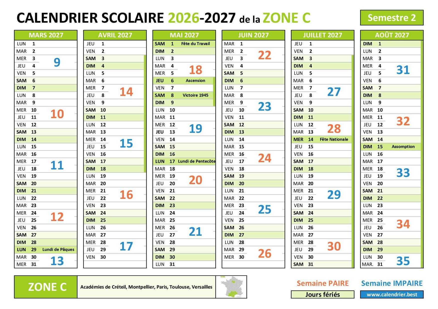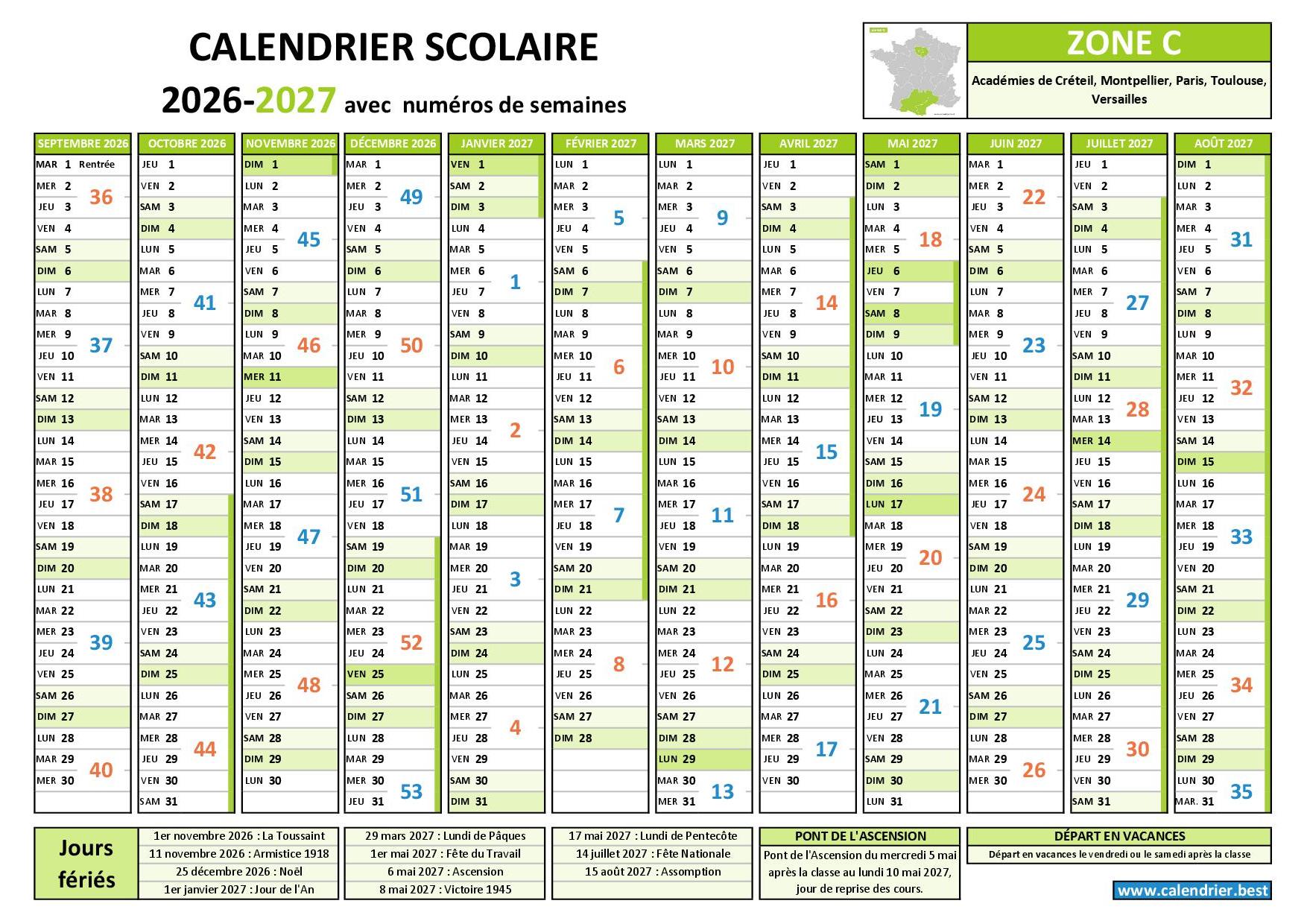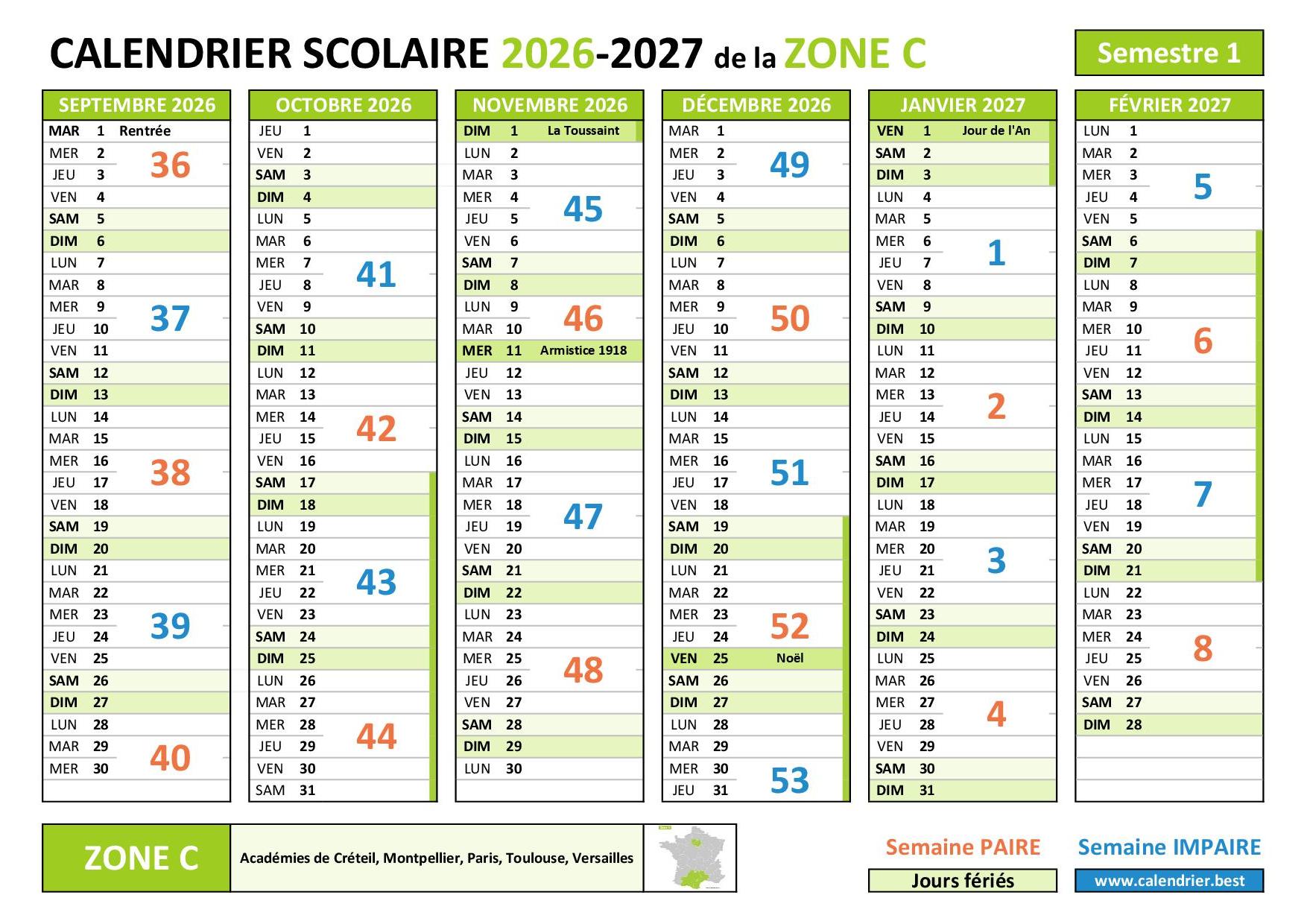 đ Notre calendrier scolaire 2026-2027 pour la zone C est disponible aux formats PDF et JPG. Retrouvez les dates des vacances scolaires et des jours fĂ©riĂ©s spĂ©cifiquement pour les acadĂ©mies de Paris, Versailles, CrĂ©teil, Toulouse et Montpellier en tĂ©lĂ©chargement libre. Ce calendrier vous permet de visualiser facilement les 5 grandes pĂ©riodes de congĂ©s suivantes : vacances de la Toussaint 2026, de NoĂ«l 2026, d'Hiver 2027, de Printemps 2027 et d'ĂtĂ© 2027.